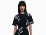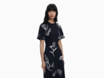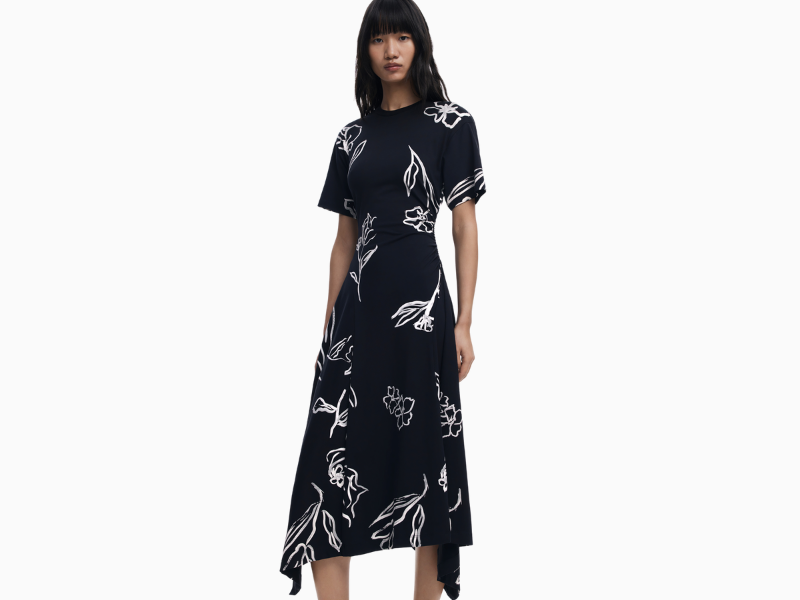 Stilren midikjole med asymmetrisk fald og sommerlig uttrykk. Designet i myk bomullsblanding med korte ermer og rund hals, dekorert med kontrastfarget blomstertrykk som gir et kunstnerisk og moderne preg. En feminin og behagelig kjole som passer både til hverdags og kveldsbruk.