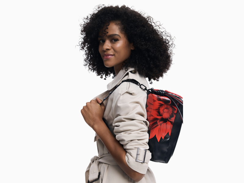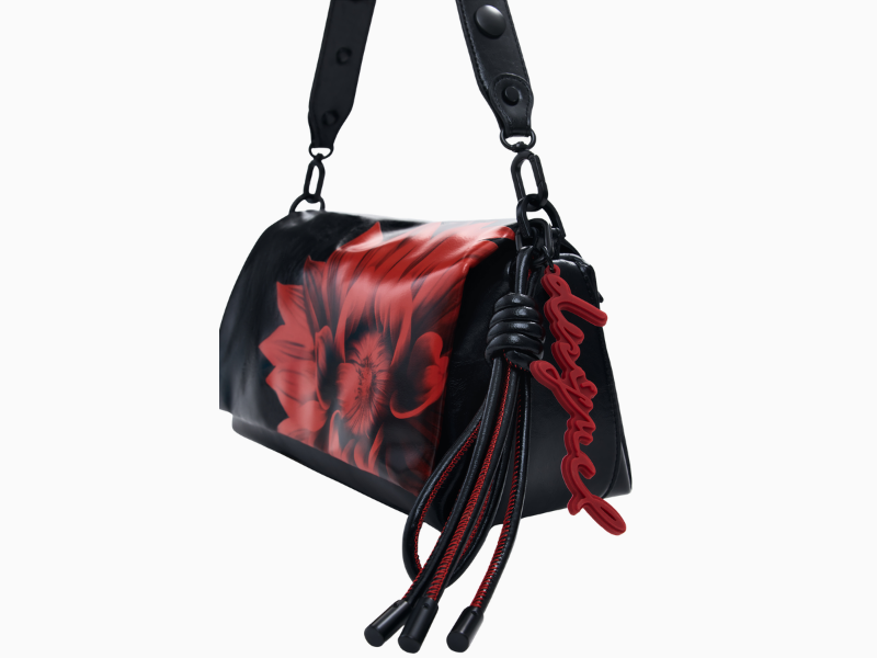 Skulderveske i imitert skinn med blank finish og stort blomstertrykk. Vesken har klaffelukking, utskiftbare håndtak og avtakbar nøkkelring en elegant og uttrykksfull detalj til antrekket.