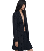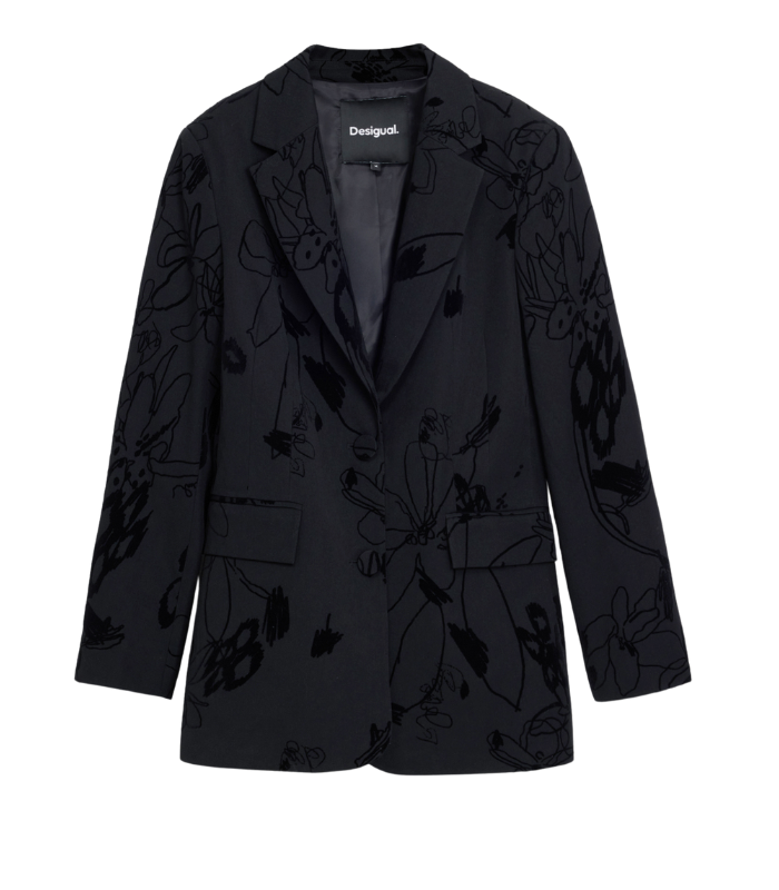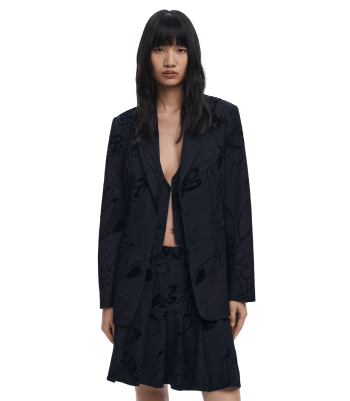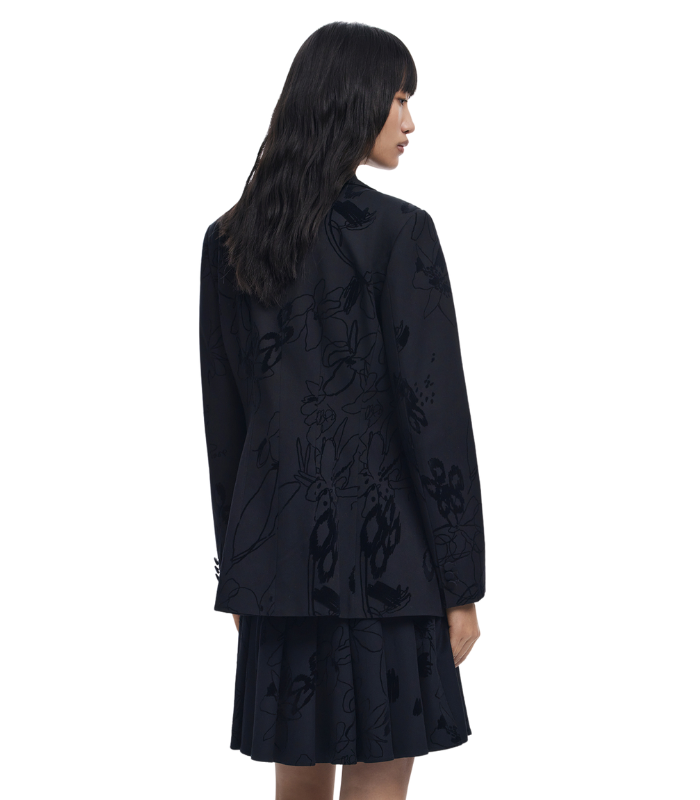 Mørk blazer med normal passform og frontlommer, dekorert med fløyelspreget Arty-inspirert mønster. Den ton-i-ton strukturen gir plagget dybde og et kunstnerisk, elegant uttrykk.