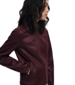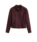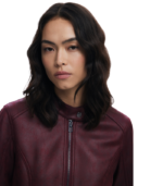 Kort jakke i imitert skinn med glidelåslukking og ståkrage (mao-krage). Designet med glatte linjer, to frontlommer med glidelås og strikket stoff på innsiden av ermene for økt komfort og fleksibilitet.