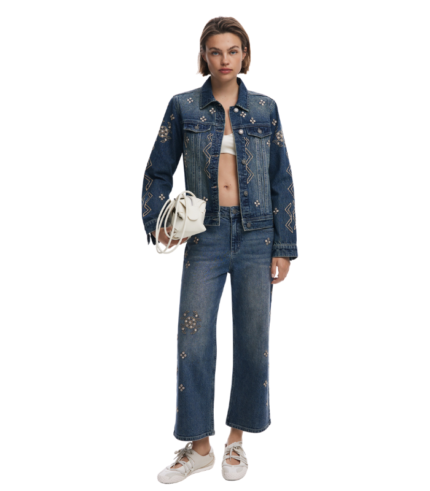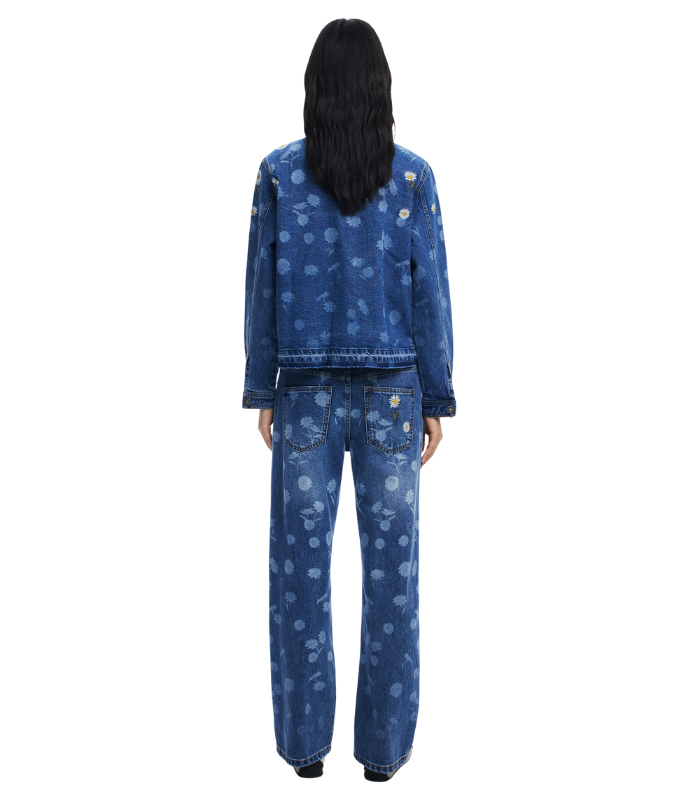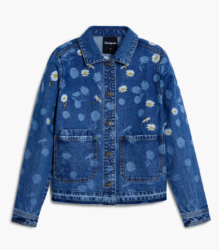 Dongerijakke i trucker-stil med forlommer, blomsterbroderi og tusenfrydprint som gir et friskt og feminint uttrykk. En tidløs jakke som passer perfekt til både jeans og kjoler.