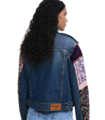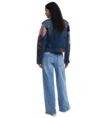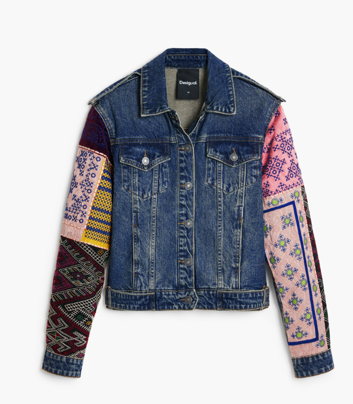 Denimjakke i trucker-stil med forlommer med klaff og ermer i etnisk inspirert patchwork-stoff. En unik kombinasjon av klassisk vasket denim og fargerike tekstildetaljer som gir et dristig og kunstnerisk uttrykk.