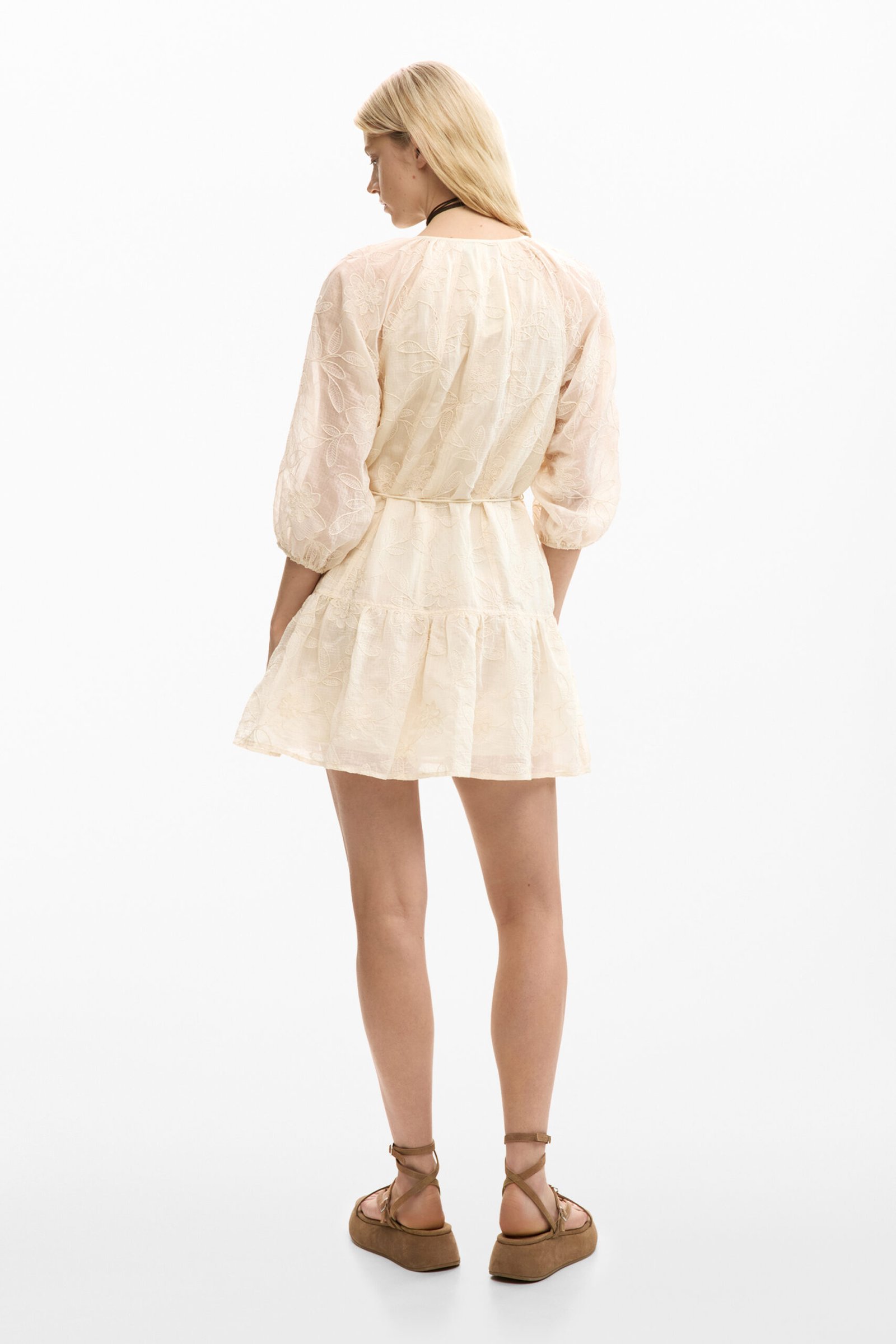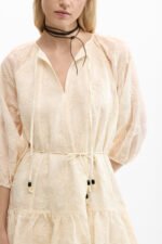 Kort kjole med lange ermer og broderte detaljer. Designet med rund hals og knyting i halsen. Modellen har belte i samme fargetone og volangkant nederst som gir bevegelse og struktur.