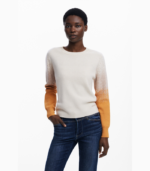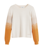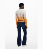 Lett genser med rund hals, lange ermer og en subtil farge gradient på ermene. Designet har en myk tekstur og et brodert logo detalj nederst for et raffinert uttrykk. Perfekt både til jeans og skjørt for et elegant, avslappet antrekk.