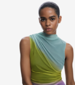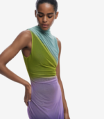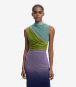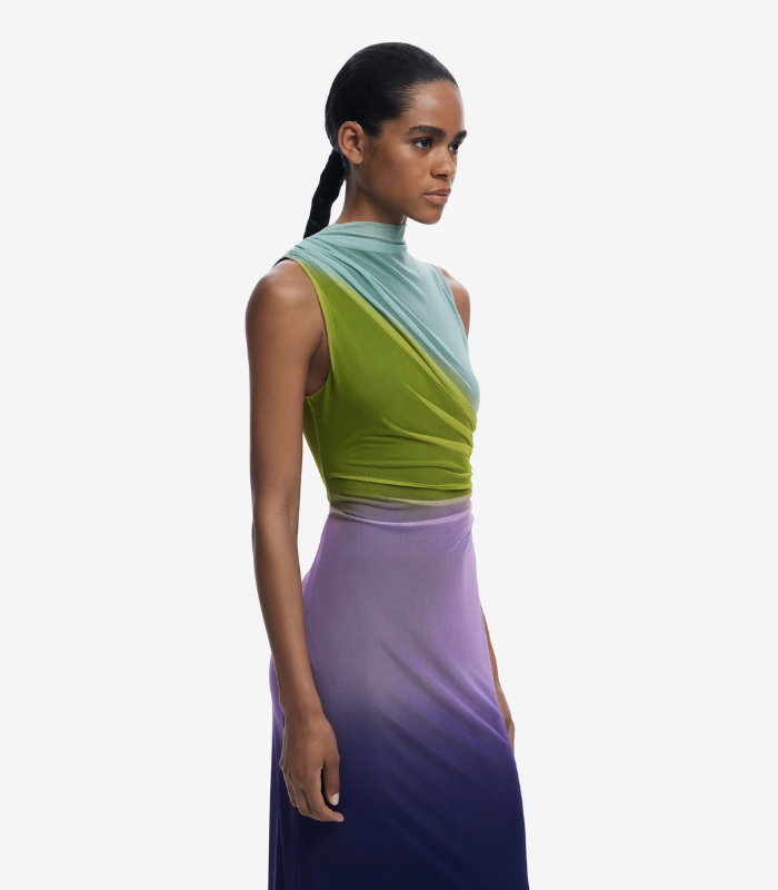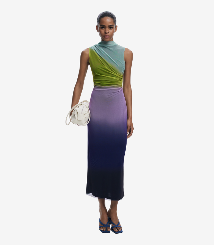 Elegant midi-kjole i tyll med et vakkert fargeforløp som glir fra lyse til mørkere toner. Kjolen har drapert front, rund hals og en smal silhuett som fremhever figuren.