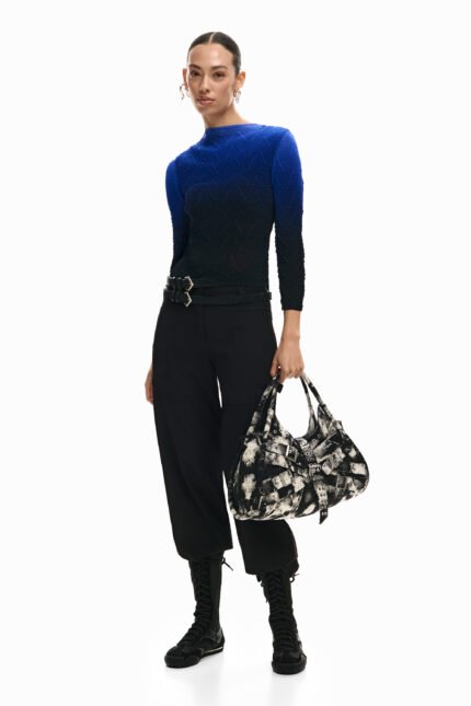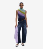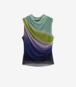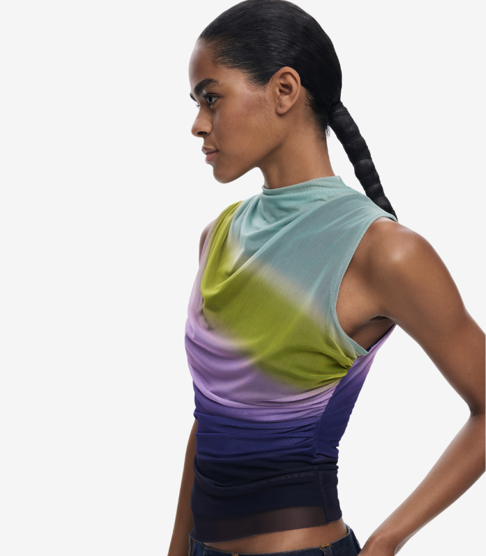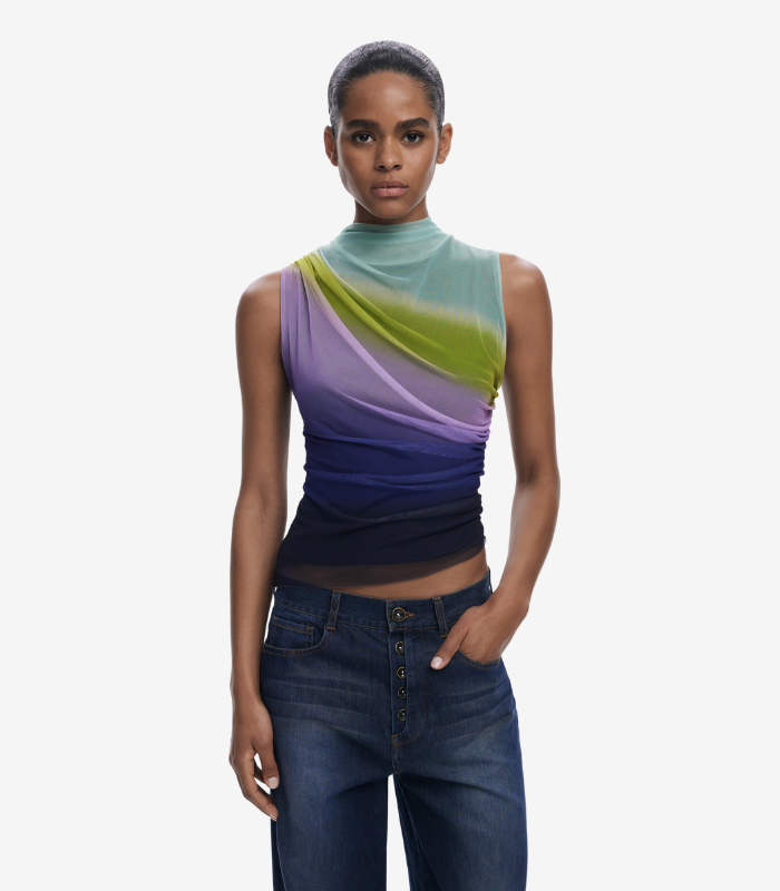 Ermeløs topp i drapert tyll design med lett høy krage og myk fargeovergang. Det delikate stoffet og de flytende linjene gir et elegant og moderne uttrykk.