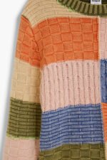 Langermet genser i myk bomullsstrikk, utformet med patchwork i ulike strikketeknikker og dekorative kontrastsømmer. Modellen har en normal passform og rund hals, og gir en komfortabel og strukturert følelse som passer til hverdagsbruk.