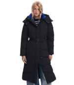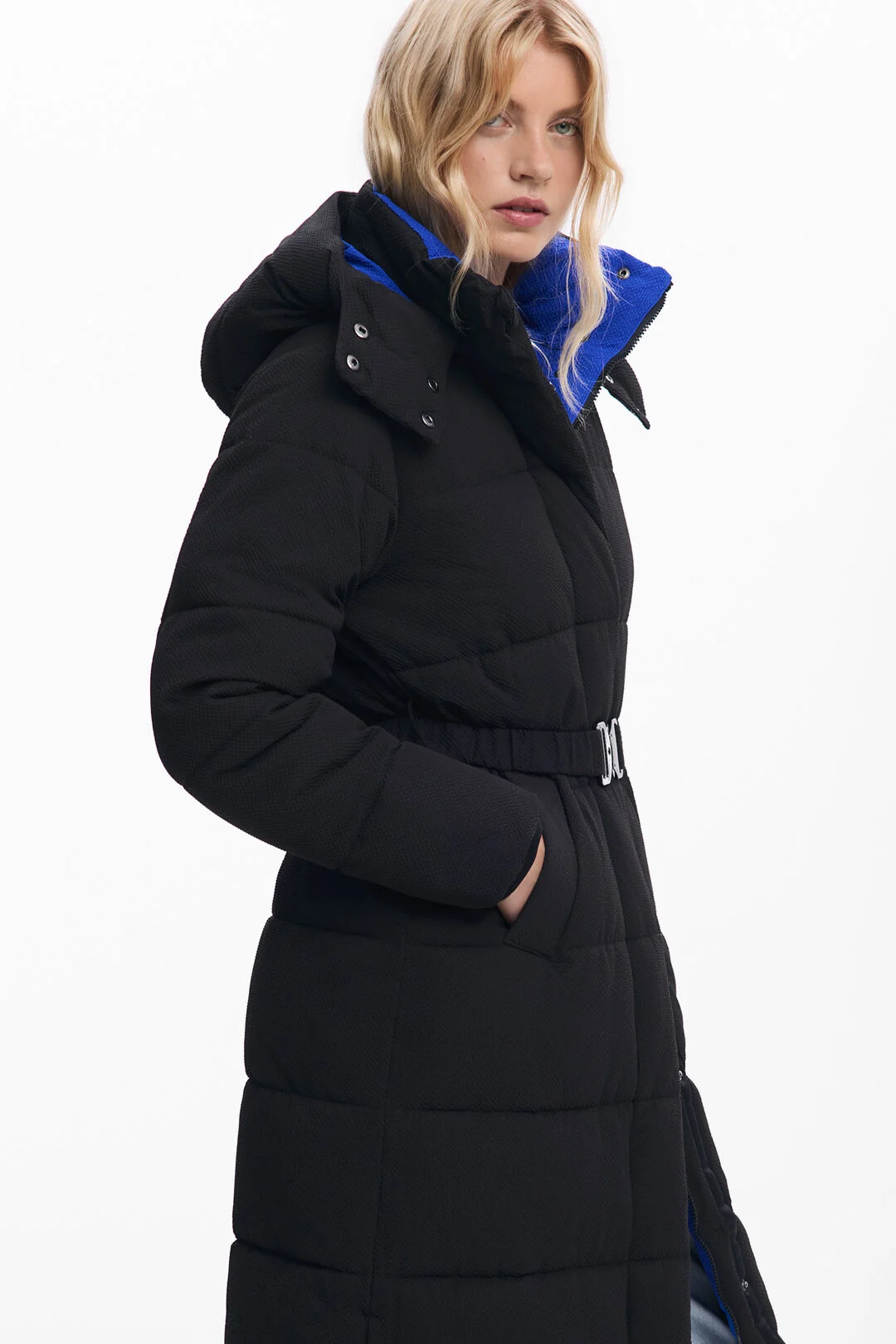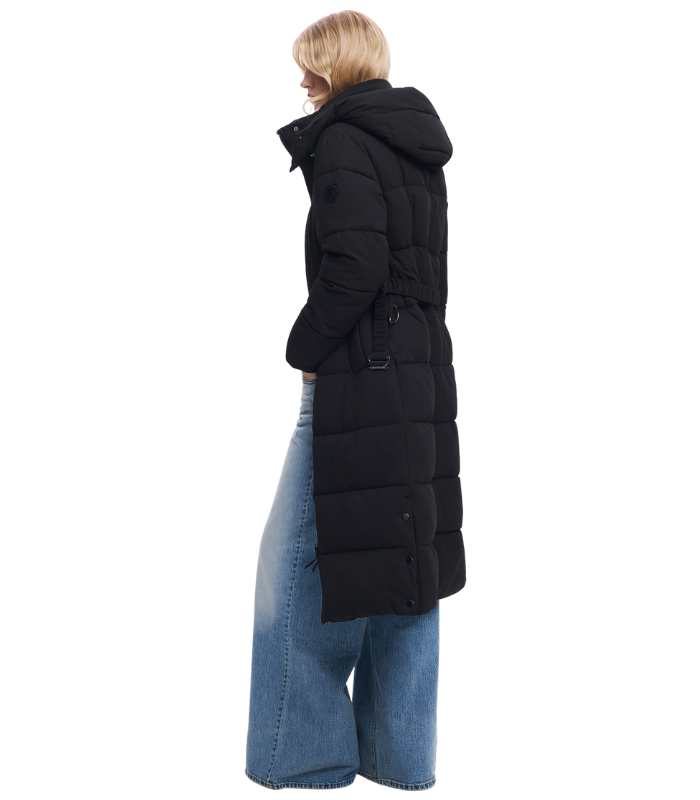 Lang vattert kåpe i trench-inspirert snitt med myk, blank overflate. Designet med avtakbart belte, forlommer og hette for komfort og fleksibilitet. Den delte kanten nederst gir bevegelse og en elegant form en perfekt kombinasjon av varme og sofistikert stil.