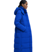 Lang vattert kåpe i trench-inspirert snitt med myk, blank overflate. Designet med avtakbart belte, forlommer og hette for komfort og fleksibilitet. Den delte kanten nederst gir bevegelse og en elegant form en perfekt kombinasjon av varme og sofistikert stil.
