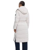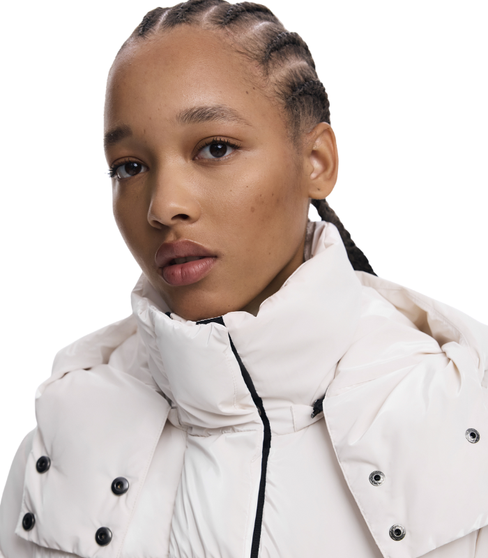 Lang vattert kåpe i trench-inspirert snitt med myk, blank overflate. Designet med avtakbart belte, forlommer og hette for komfort og fleksibilitet. Den delte kanten nederst gir bevegelse og en elegant form en perfekt kombinasjon av varme og sofistikert stil.