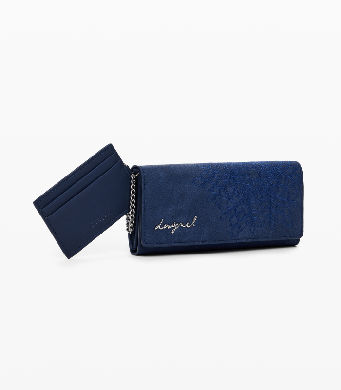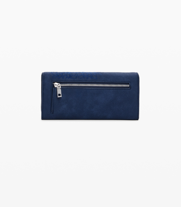 Mellomstor lommebok i imitert skinn med brodert ornamentmønster og avtakbar kortholder. Designet i ensfarget stil med glidelås og trykknapplukking.