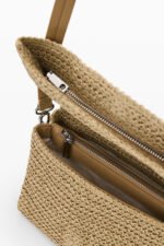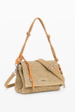 Mellomstor veske i raffia med rektangulær form og klaff. Designet med utskiftbare skulderstropper og avtakbar charm med kortlomme. Preget logo på etikett i skinnimitasjon gir et strukturert og gjennomført uttrykk.