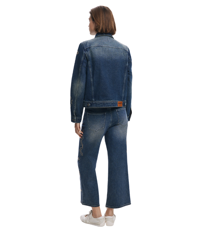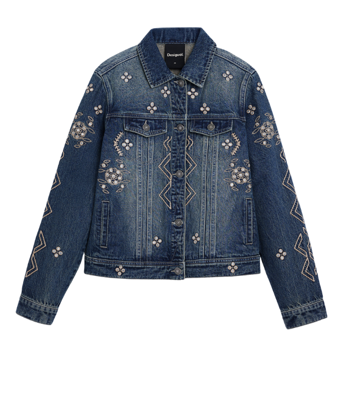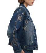 Klassisk denimjakke i trucker-stil med vintagevasket finish, dekorert med broderte detaljer og små speilelementer som reflekterer lyset. Et tidløst plagg som kombinerer denimens klassiske uttrykk med et kunstnerisk preg.