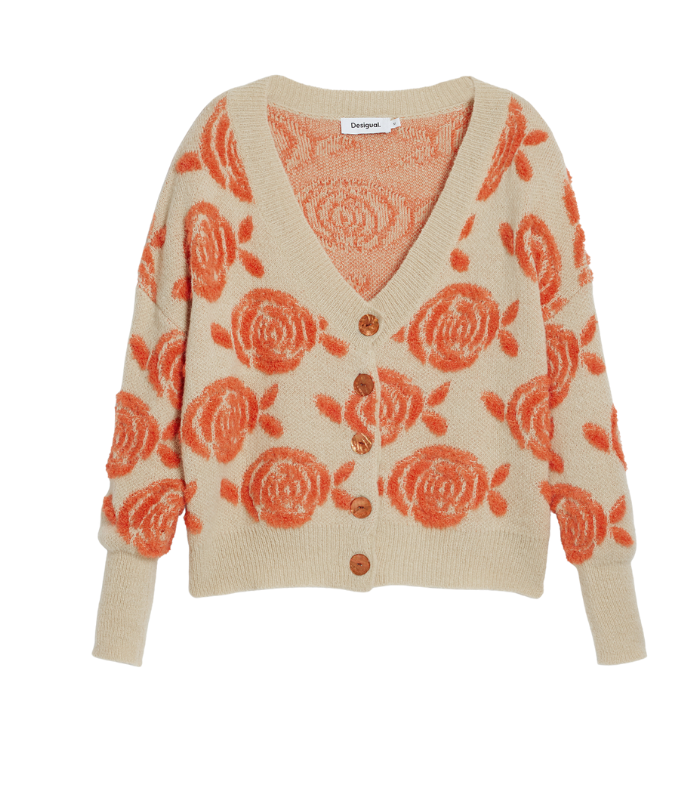 Strikket cardigan med lange ermer, V-hals og frontlukking med knapper. Designet i en myk tekstur med stort rosemønster som gir et feminint og tidløst uttrykk.