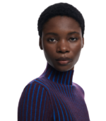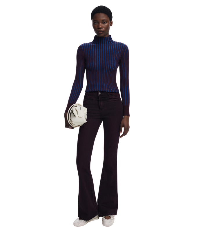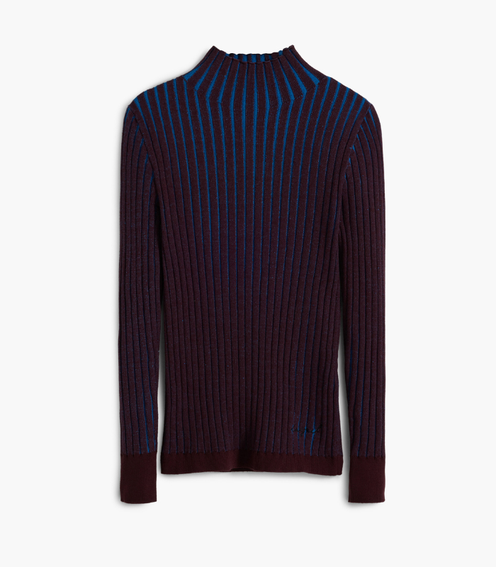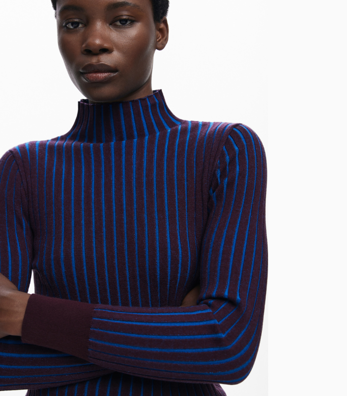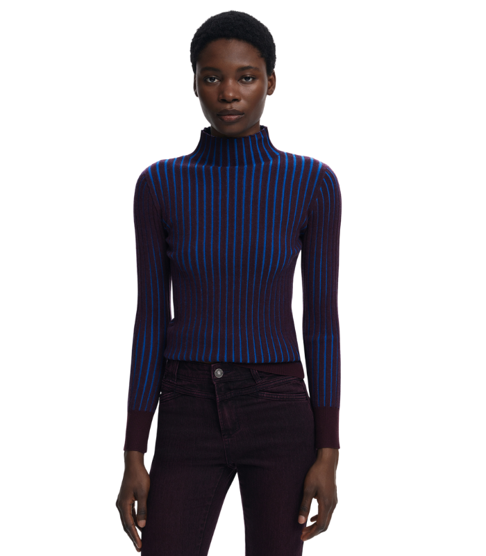 En sofistikert ribbestrikket genser med smal passform og høy hals. Det to-fargede 3D-mønsteret skaper dybde og bevegelse, mens den myke og elastiske strikken gir både komfort og et moderne uttrykk. Perfekt alene eller under en blazer for et tidløst, stilig antrekk.