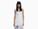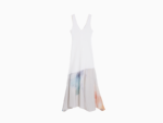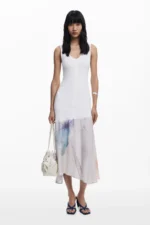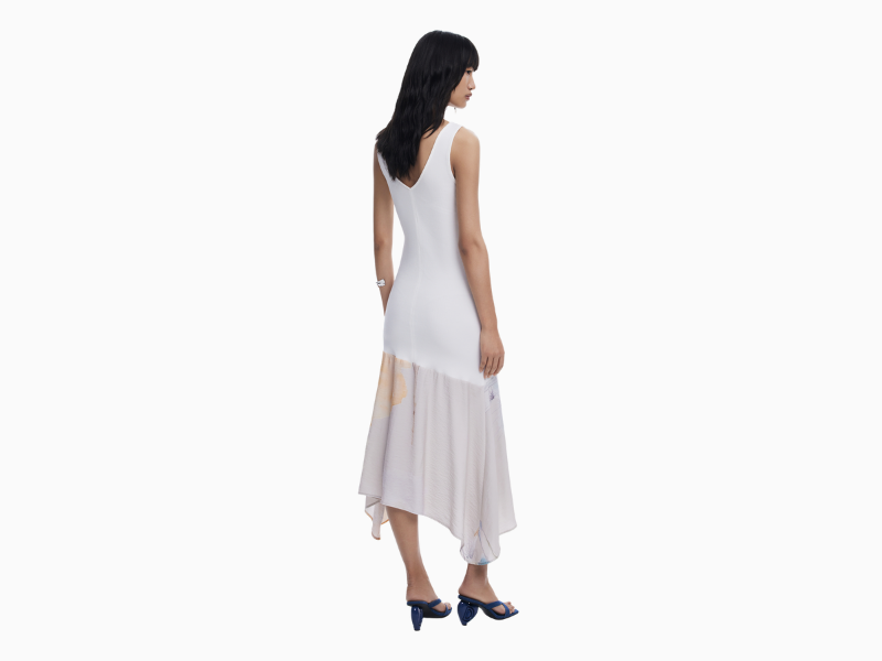 En feminin og moderne kjole med ermeløst design og dyp V-hals. Den asymmetriske nederdelen prydes av et delikat akvarell inspirert blomstertrykk som gir et kunstnerisk uttrykk mot den ensfargede overdelen. Et balansert design som kombinerer komfort, eleganse og letthet perfekt for både hverdager og spesielle anledninger.